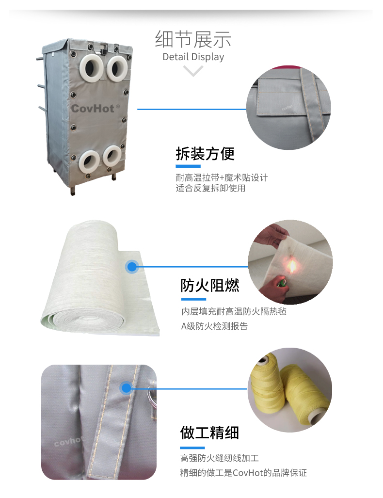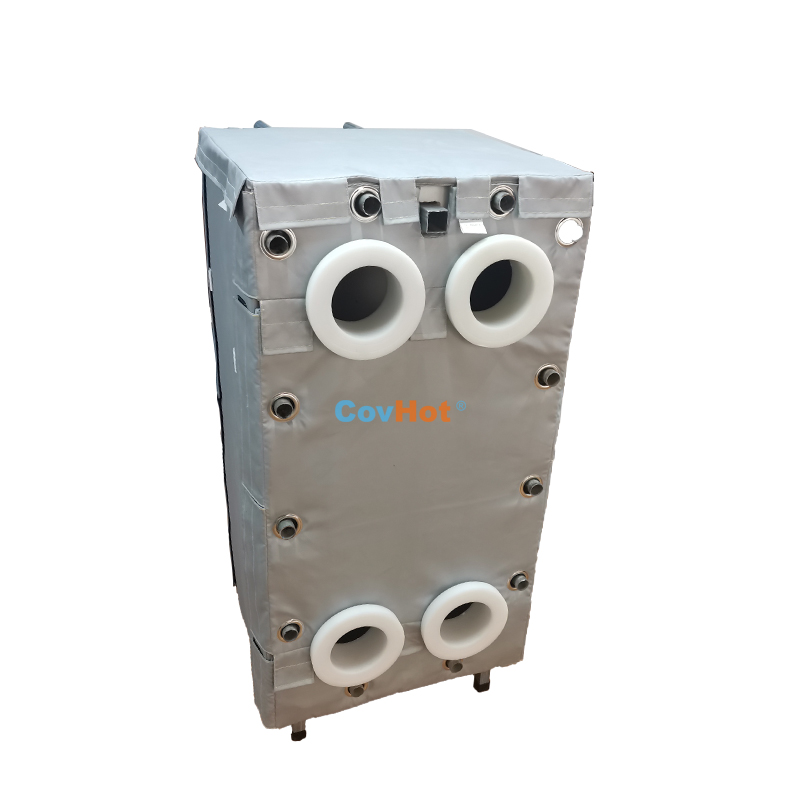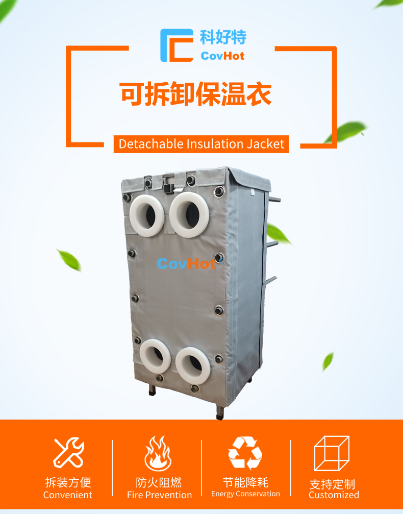針對以上的問題,河北科好特科技有限責任公司自主研發的節能型板換保溫衣,可以有效減少換熱器的熱量損耗,而且在施工過程中安裝拆卸方便,節省人工,可拆卸保溫衣還可重復使用,起到節能降耗的效果。科好特可拆卸保溫衣根據設備不同的尺寸形狀量身定制,可廣泛用于換熱器、閥門、管道及其它需要保溫或防凍的領域。